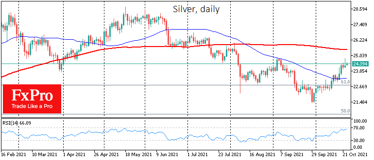 Важными бычьими сигналами также являются внушительное ралли по серебру, которое вырвалось из глухого боковика начала месяца. Кроме того, акции добывающих золото и серебро компаний получают устойчивую поддержку с конца сентября, указывая что долгосрочные инвесторы посчитали медвежье ралли сектора оконченным.