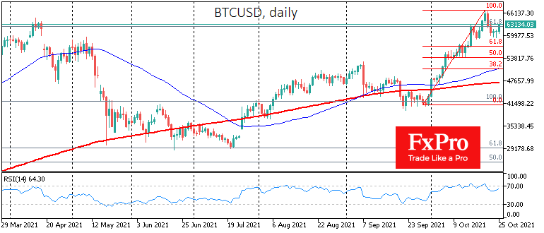 Биткоин по-прежнему является локомотивом рынка, и можно с уверенностью воспринимать его в качестве барометра настроений. За последние сутки монета подросла на 2% до $62.7K. В течение выходных Биткоин торговался в узких диапазонах, и сейчас внимание инвесторов сосредоточено на вероятности окончания фазы коррекции после достижения исторического максимума. Если падение монеты не привело ее даже к просадке ниже $60K, рынок будет воспринимать это исключительно с положительной точки зрения.