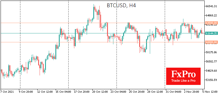 Биткоин остается в боковике, почти не выходя за пределы диапазона $60-63.5 последние две недели. Провал к нижней границе диапазона в конце дня с утра в пятницу выкупается, и курс BTCUSD вернулся к $62.2K.