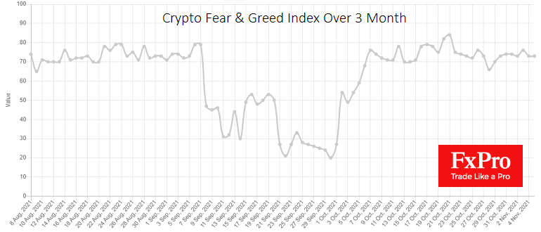 Аналогичное балансирование видно в криптовалютном индексе страха и жадности, который движется на уровнях чуть выше 70 с начала октября, показывая отметку 73 в последние сутки, уверенно находясь на территории жадности.
