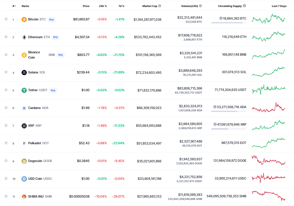 По итогам недели среди топовых монет блистали Binance Coin (+21.7% за 7 дней), Solana (+21.7%) и Polkadot (+22.6%). А вот собаки оказались истощены битвой: Dogecoin теряет 9.5%, Shiba Inu – 28%.