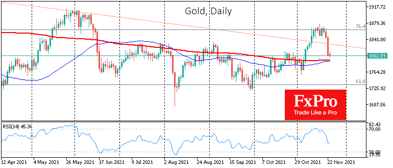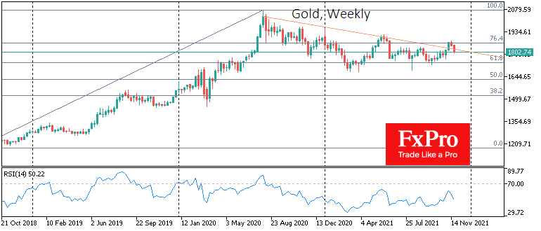 Резкое снижение золота под эти уровни и закрепление под ним рискует перечеркнуть бычий прорыв в начале ноября.