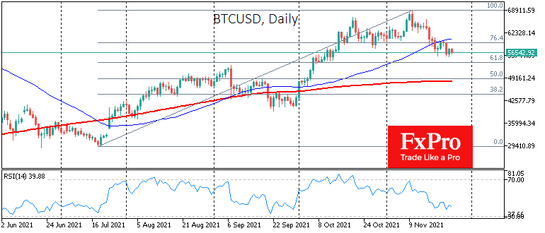 На дневных графиках курс BTCUSD остается вблизи минимумов последних семи дней, ниже 50-дневной скользящей средней, а индикатор RSI курсирует вблизи отметки 40.