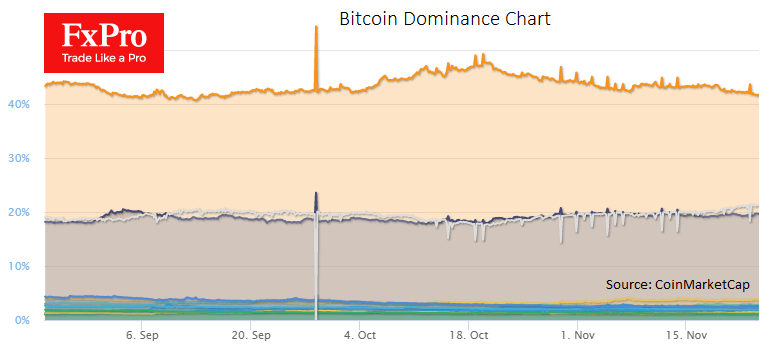 Чуть более месяца назад сформировался тренд на снижение доли эталонной криптовалюты в общей капитализации рынка. От пиковых 49.2% на 19 октября доля биткоина упала до 41.7%. Оптимистично настроенные участники рынка указывают на наличие внушительного спроса на альткоины, формируя эту тенденцию.