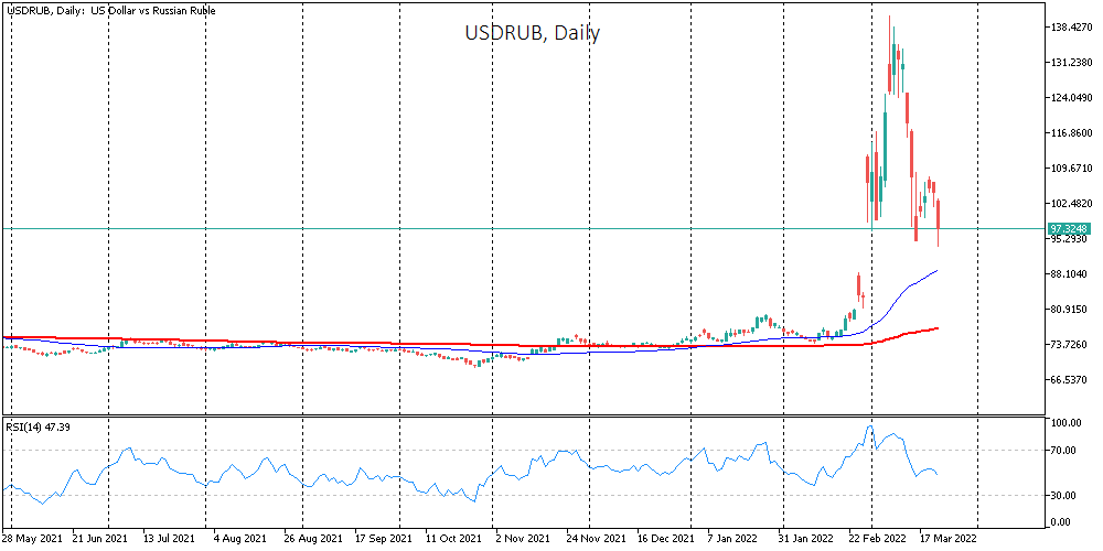 Российский рубль прибавляет более 3% к доллару, торгуясь вокруг 100 на новостях, что «так называемые недружественные страны» должны будут платить за газ рублями. Импульсивно (так как российский валютный рынок остается крайне неликвидным) USDRUB опускалась ниже 95.