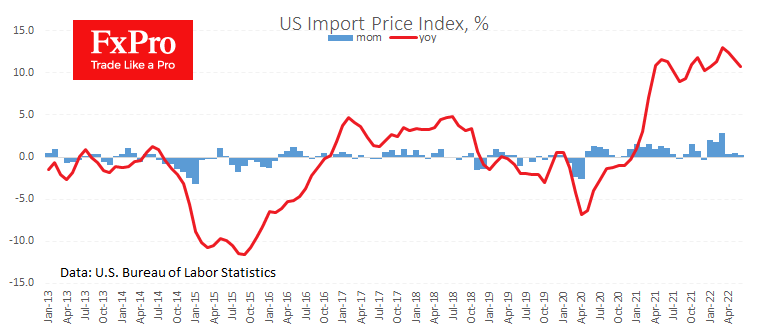 Хорошая новость для участников рынка – это охлаждение темпов роста цен на импорт. За месяц индекс прибавил 0.2% (ожидалось 0.7%), а к июню прошлого года рост составил 10.7% против 11.6% месяцем ранее и ожиданий ускорения до 12.1%.