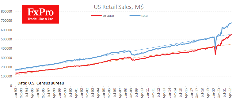 По предварительным оценкам, в июне продажи в США выросли на 1% против ожидаемых 0.9% и сокращения на 0.1% месяцем ранее. Не слишком большое превышение ожиданий, учитывая, что данные не скорректированы на инфляцию, которая ранее на неделе оказалась выше ожиданий.