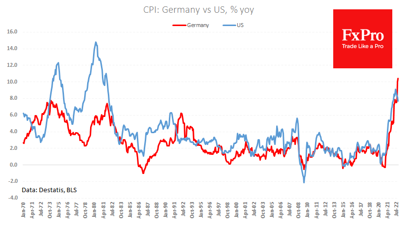 Официальный отчёт сегодня подтвердил инфляцию на уровне 10.4% г/г в октябре. За месяц CPI прибавил 0.9% после скачка на 1.9% в месяцем ранее. Годовые темпы роста цен продолжали бить рекорды в Европе, в то время как в США они устойчиво замедляются с июня.