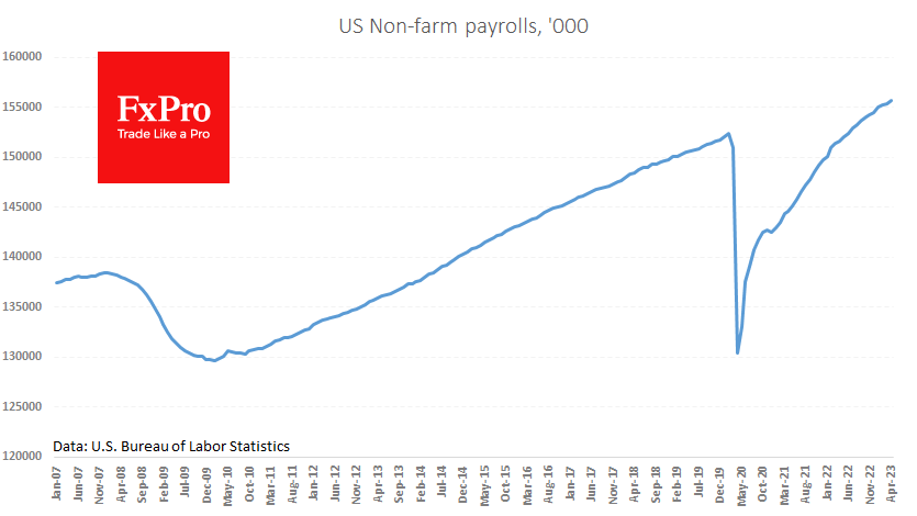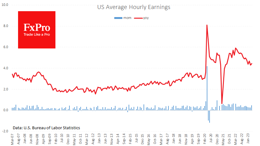 Уровень безработицы снизился до 3.4%, при том, что аналитики ожидали увеличения с 3.5% до 3.6%. Доля экономически активного населения остаётся на высоком уровне 62.6%, продолжая ползти вверх по направлению к 63.4%, наблюдавшемуся до локдаунов на covid-19. Восстановление стоит связать как со снижением страха заболеть, что оставляло людей дома в 2020–2022, но также и с повышенной инфляцией, которая «выгоняет» людей на работу в попытке сохранить уровень жизни.