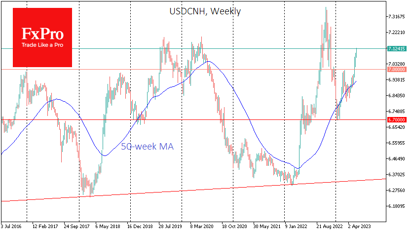 Слабость экономики, низкая инфляция и явное непротивление слабости юаня со стороны ЦБ настраивают на дальнейший поиск парой USDCNH своей вершины. Ближайшим ориентиром видятся пики 2019 и 2020 годов у 7.19, куда пара может сравнительно организованно дойти за пару недель, сохраняя текущий темп роста. Однако нельзя исключать, что нынешнее движение выдохнется не раньше, чем юань ослабеет до 7.3 за доллар, приблизившись к пикам октября прошлого года.
