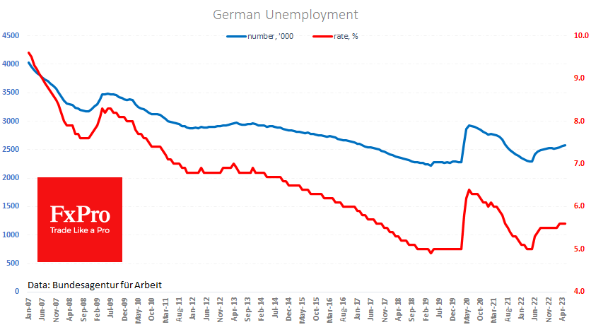 Тем не менее, собственные данные по еврозоне сегодня не так плохи. Число безработных в Германии выросло на 9 тыс., в сравнении с 23 и 19 тыс. в предыдущие два месяца. Безработица растёт значительно медленней, чем во время рецессий 2009 и 2020 годах, а уровень безработицы (5.6%) низкий по историческим меркам.