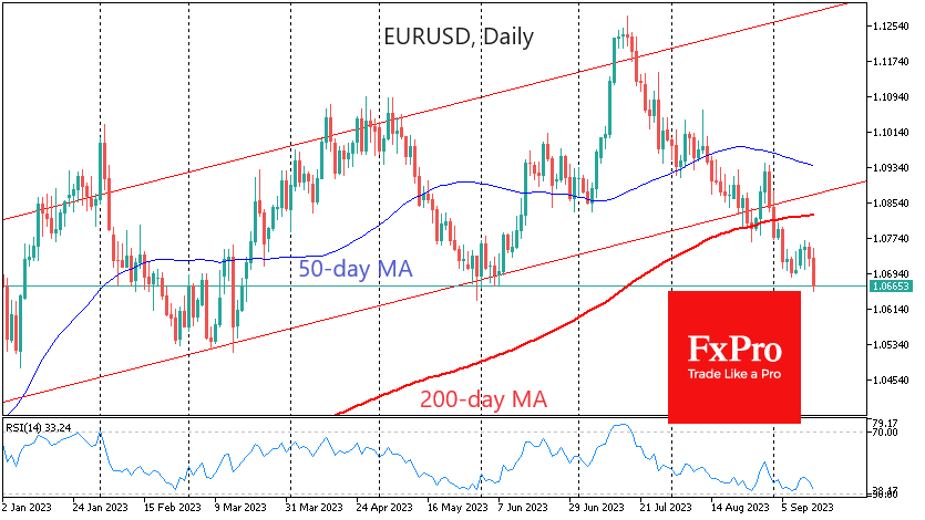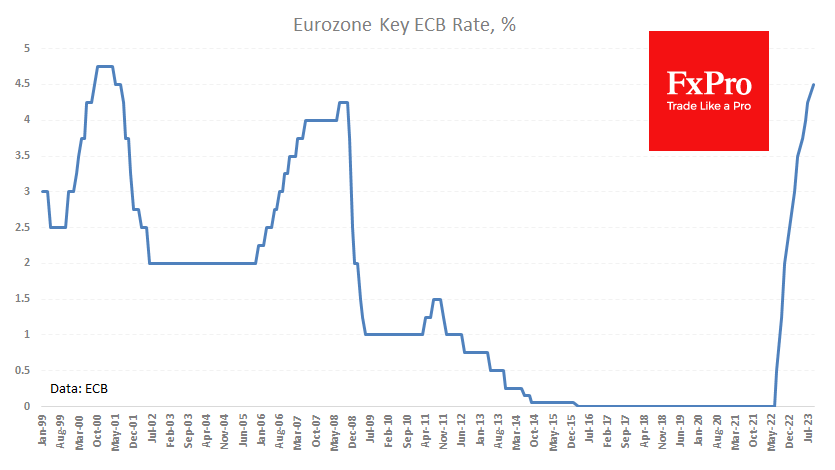 ЕЦБ поднял ставку на 25 пунктов до 4.5%, вопреки средним прогнозам аналитиков, которые не ожидали изменений. Однако не решение, а комментарии к нему были драйвером на рынках. ЕЦБ назвал текущие ставки достаточными, чтобы вернуть инфляцию к норме со временем. Этот внезапный пассаж был импульсивно расценен как жирный намёк, что ставка достигла пика.