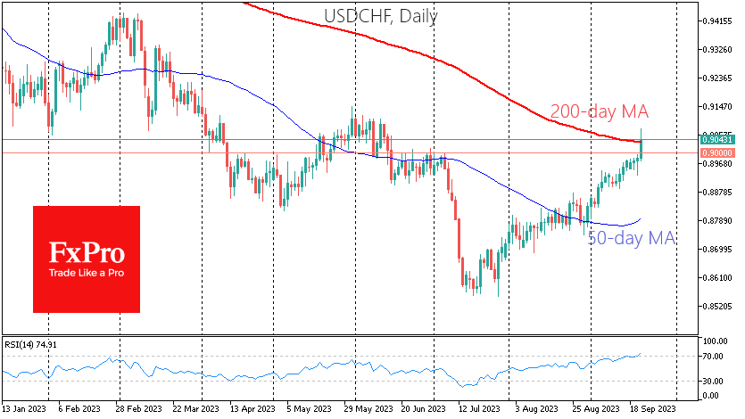 Швейцарский франк потерял 1.5% к доллару в виде реакции на ястребиную паузу ФРС и «сюрприз» от НБШ. Пара USDCHF превысила 0.9050, поднявшись до максимумов за более чем три месяца, переживая равномерное ослабление в последние два месяца.