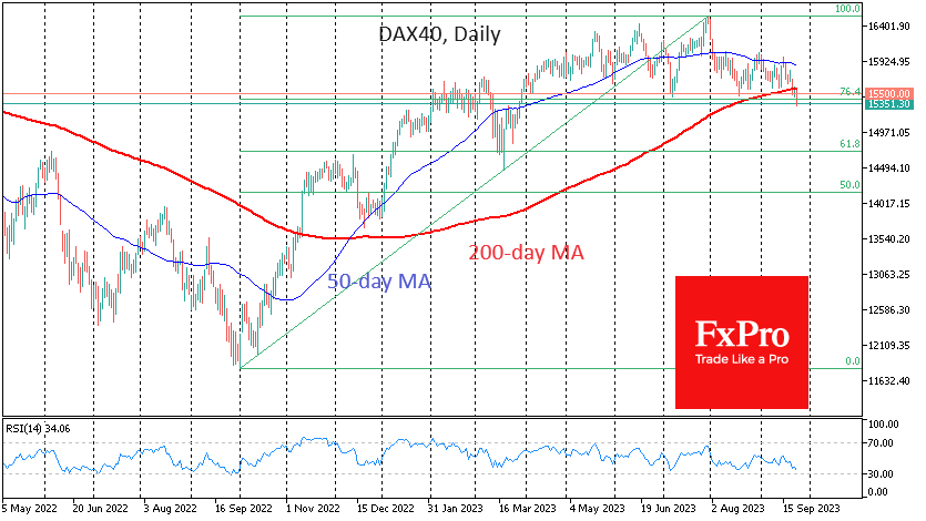 Германский DAX40 в понедельник в конце прошлой недели провалился под 200-дневную скользящую среднюю, и в понедельник проторговывает территорию под этой линией, которая также совпала с важной линией поддержки на 15500.