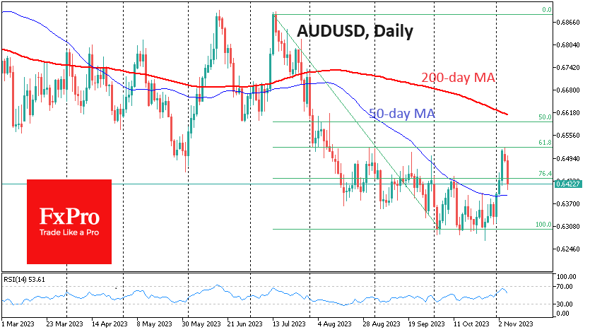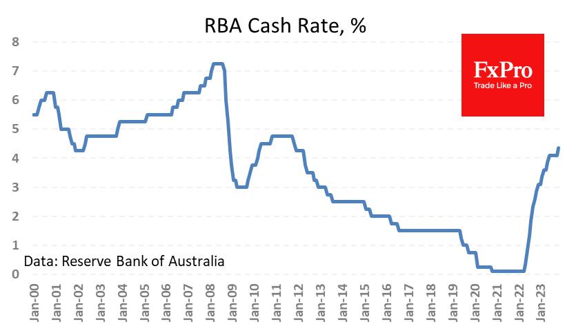 Импульс распродаж ударил по AUDUSD после решения поднять ключевую ставку на 25 базисных пунктов до 4.35% - максимума за 12 лет. Решение соответствовало ожиданиям, поэтому касание уровня 0.6500 дало старт значительной распродаже, заставившей пару ненадолго отступить ниже 0.64.