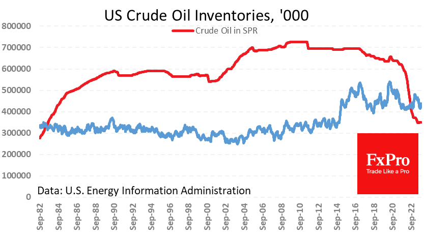 Накануне вечером EIA после паузы опубликовала два недельных отчёта по коммерческим запасам и производству нефти. Средние объемы производства сохраняются на уровне 13.2 млн баррелей в сутки последние полтора месяца. Столько же времени на одном уровне – 351.27 млн баррелей – удерживается объём запасов в Стратегическом топливном резерве.