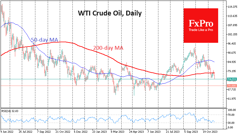 Падение цены барреля WTI под $75 открывает дорогу на спуск в область $67-70, где цена находила поддержку с мая по июнь. В случае снижения в эту область мы можем столкнуться с новой порцией вербальных интервенций со стороны ОПЕК+, как это было ранее в этом году. Их отсутствие, как в 2014 году, напротив, усилит давление на цену.