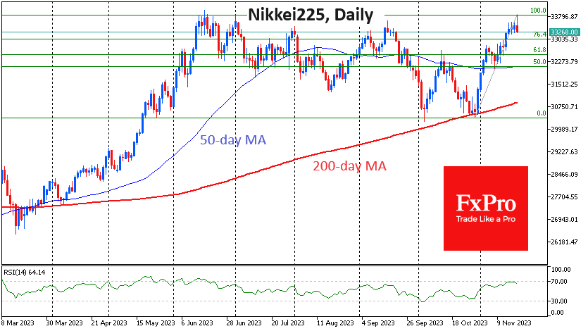 Значимые движения сегодня на рынках Японии. Торги на рынке акций там начались с роста более чем на 1%, доведя индекс Nikkei225 до 33850 – второй раз с июня протестировав максимумы за 33 года. Касание максимумов запустило мощную распродажу, и индекс теряет сейчас 0.6% от открытия дня, что может быть началом более широкой коррекции или продолжительного отката.