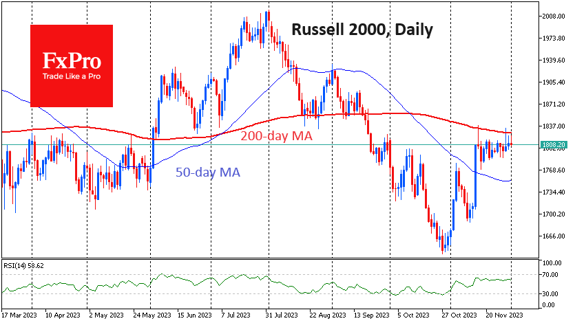 Индекс компаний малой капитализации Russell2000 – антипод DJIA – бьётся о горизонтальное сопротивление вблизи 1810 вот уже более двух недель, не в силах забраться выше 200-дневной скользящей средней, несмотря на впечатляющий разворот в конце октября.