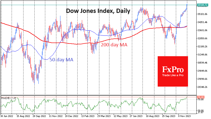 Dow Jones взял высоту 36 000, что лишь на 2.5% ниже исторического пика от января 2022. Выше этого круглого уровня индекс торговался несколько дней в ноябре 2021 года и непродолжительный период в декабре и январе 2022.