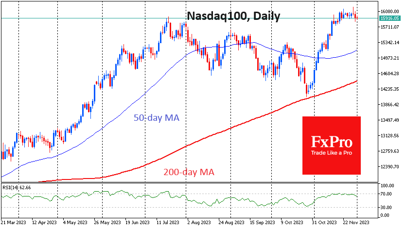 Есть и другой тревожащий быков момент – динамика других индексов акций. Nasdaq100 – путеводная звезда инвесторов последних лет – стабилизировался в узком диапазоне с начала прошлой недели, попытка развить рост в среду натолкнулась на распродажу, и четверг также ушёл в зачёт медведей.
