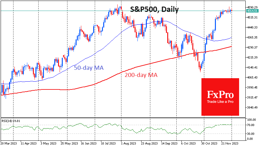 Индекс S&P500 – главный рыночных бенчмарк – приклеился к уровню 4560. Быки сумели закрыть гэп с начала августа, давший старт последней коррекции, и, похоже, выбились из сил. Побочный эффект этого – сжатие волатильности и падение индекса VIX до многолетних минимумов, откуда также нередко происходили развороты.
