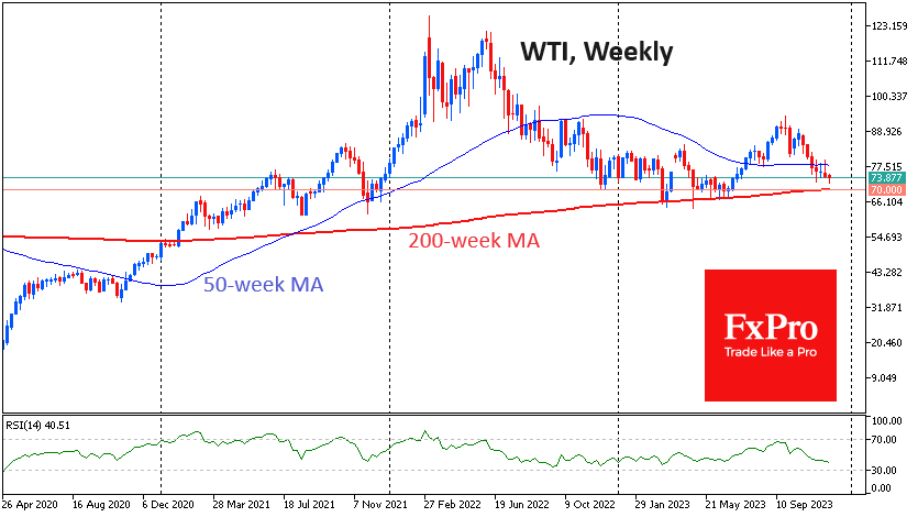Но вполне возможно, что давление на цены в последние дни было распродажей, после неудачного теста 200-дневной скользящей средней. От текущих уровней у нефти есть потенциал снижения до $66-70 за баррель WTI и $70-73 за Brent, откуда её выкупали с марта по конец июня и ещё несколько раз с июля 2021 года. Снижение в эту область вернёт в фокус уровень 200-недельной средней, для слома которой требуются события глобального масштаба вроде разрыва внутри ОПЕК, мировая пандемия или аномальная волатильность на финансовых рынках.