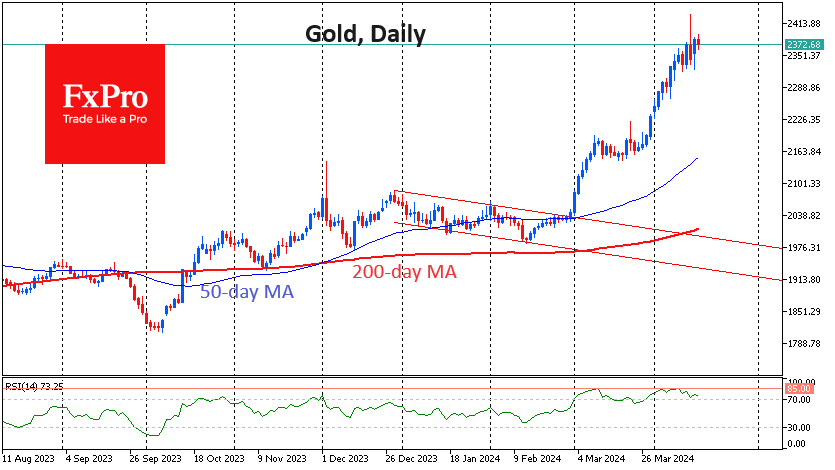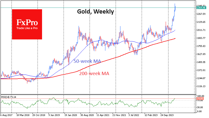 На наш взгляд, разгон цены в четверг и первой половине дня в пятницу оказался столь значительным, потому что происходил на территории разреженного воздуха после многих дней обновления максимумов, и зацепил волну стоп-ордеров выше $2400.