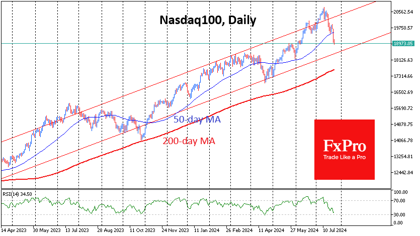 Технические причины также среди подозреваемых. Распродажа в Nasdaq100 набрала оборота после того, как индекс опустился ниже 50-дневной скользящей средней. В июне и июле индекс уходил высоко в область перекупленности на дневных таймфреймах по RSI.