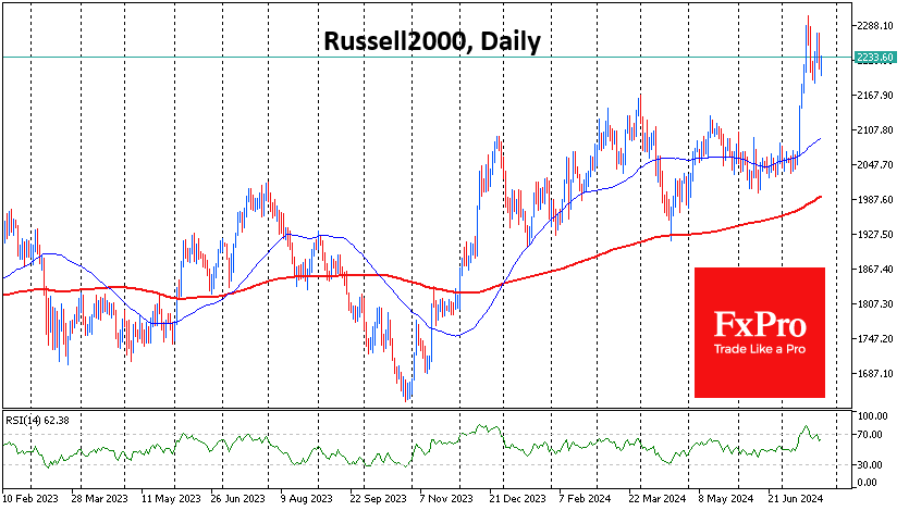 На стороне быков по-прежнему идея ротации из Big-Tech в мелкие компании, так как Russell 2000 как раз 11 июля начал своё ралли, и сейчас на 7.5% выше уровней этой стартовой точки. То есть, хотя просадка по многим акциям довольно болезненная, она объясняется явным их перегревом ранее.