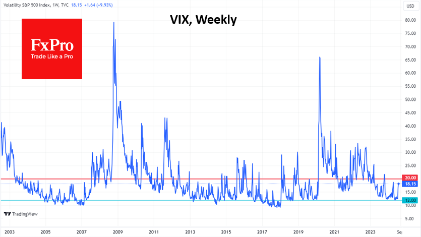 Также мы обращаем внимание на индекс VIX. Он немного не дошёл до уровня 19 в среду, достигнув максимума за 3 месяца. По нашим наблюдениям, значимые распродажи приходили на рынок лишь на фоне скачка VIX выше 20.