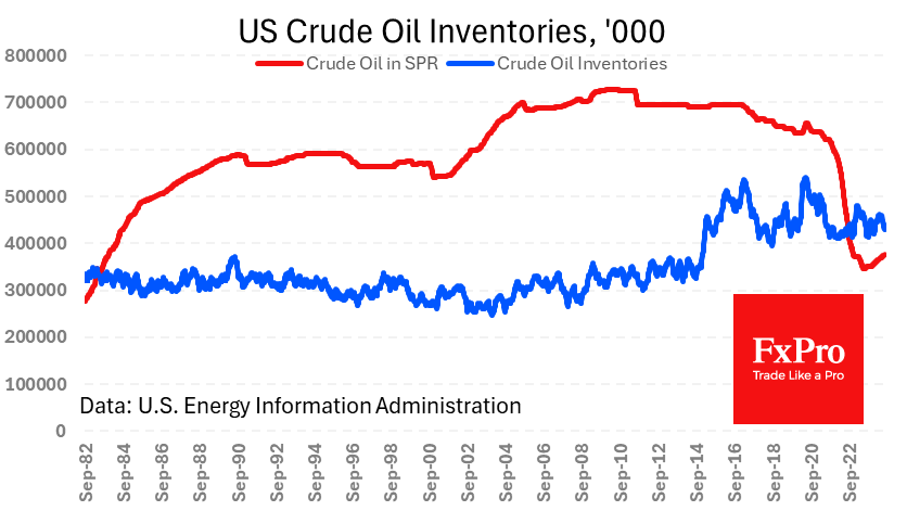 Коммерческие запасы сырой нефти на 2% ниже уровня годом ранее, что находится в рамках нормального диапазона колебаний и не оказывает видимого влияния на котировки. Продолжаются покупки в стратегический резерв, который подрос на 8.5% к своим минимумам, установленным чуть более года назад, но остаётся на 42% ниже уровня четырёхлетней давности. Потребуется почти 10 лет покупок в текущем темпе, чтобы вернуть стратегические запасы к уровню начала июля 2020 года.