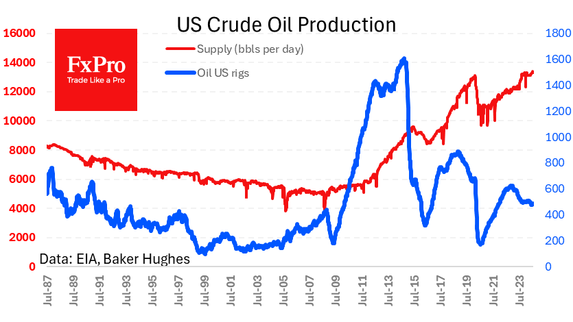 Буровая активность остаётся слабой: на прошлой неделе количество нефтедобывающих буровых установок снизилось с 485 до 483, а с учётом природного газа – с 588 до 586. Поставки нефти сократились с рекордных 13.4 до более привычных 13.3 млн баррелей в сутки. Производители сохраняют максимальную добычу при исторически низкой буровой активности, что скорее связано с нежеланием активно инвестировать в расширение добычи, чем с повышением эффективности.
