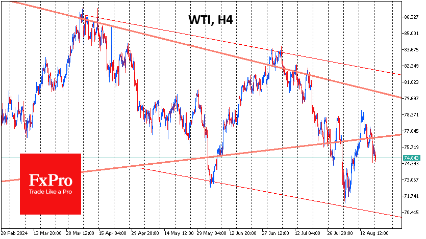 Стоимость барреля WTI снижается четыре из последних пяти торговых сессий, подчёркивая доминирование медведей. Усиление продаж наблюдается при росте выше $78, что находится вблизи важных технических уровней.