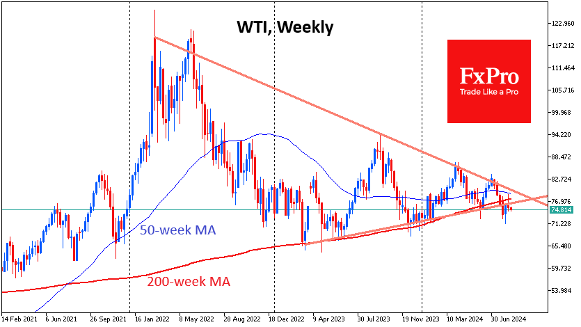 200-недельная скользящая средняя, которая была сильным уровнем поддержки последние три года, теперь имеет высокие шансы стать серьёзным сопротивлением. В конце июля нефть сломила тенденцию к консолидации, формировавшуюся с апреля 2022 года. Неудачная попытка цены забраться вверх может усилить продажи, став показателем разворота долгосрочной тенденции.
