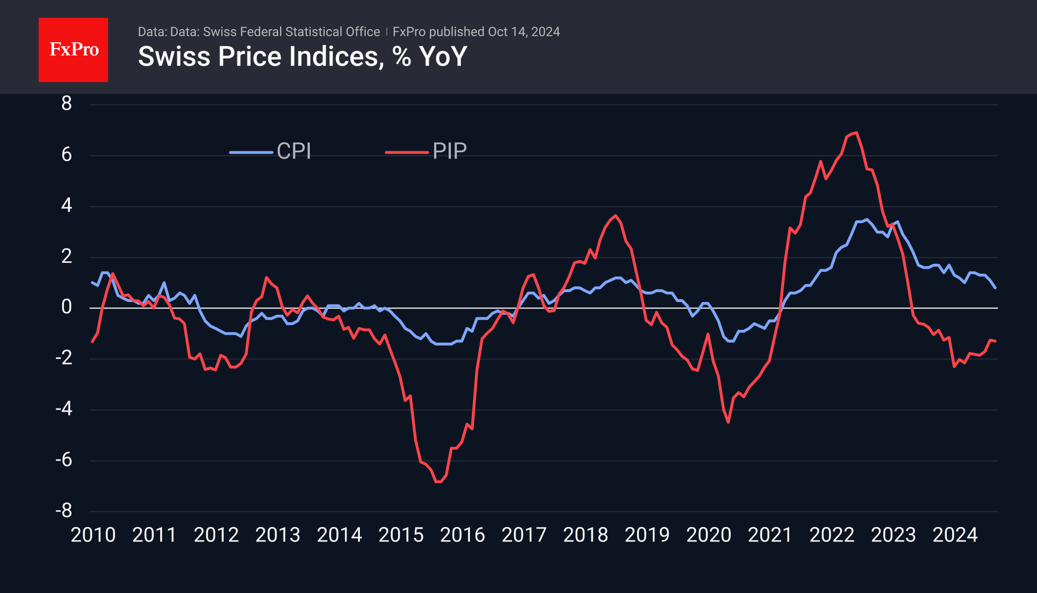 Слабость цен производителей и импорта поддерживает идею о возможности дальнейшего смягчения монетарной политики Швейцарии в предстоящие месяцы. Сентябрьские оценки потребительской инфляции также показали замедление до 0.8% г/г. Отрицательная годовая динамика в ценах производителей обещает продолжить тянуть вниз потребительскую инфляцию.