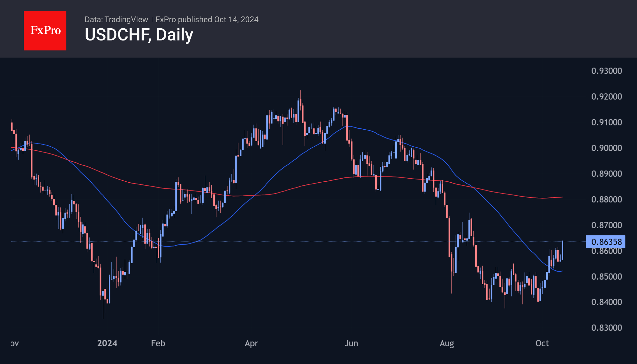 Слабость инфляции, как и в случае с Китаем, является фундаментальным негативным фактором для национальной валюты. USDCHF прибавил 0.8% с начала дня в понедельник, ускорив свой рост после сегодняшнего инфляционного отчёта, и примерно копируя амплитуду роста индекса доллара с минимумов в конце сентября, прибавив 3%. Следующими сопротивлениями на пути роста пары могут стать области предыдущих локальных максимумов на 0.8720 и далее в виде 200-дневной скользящей средней вблизи 0.8810.