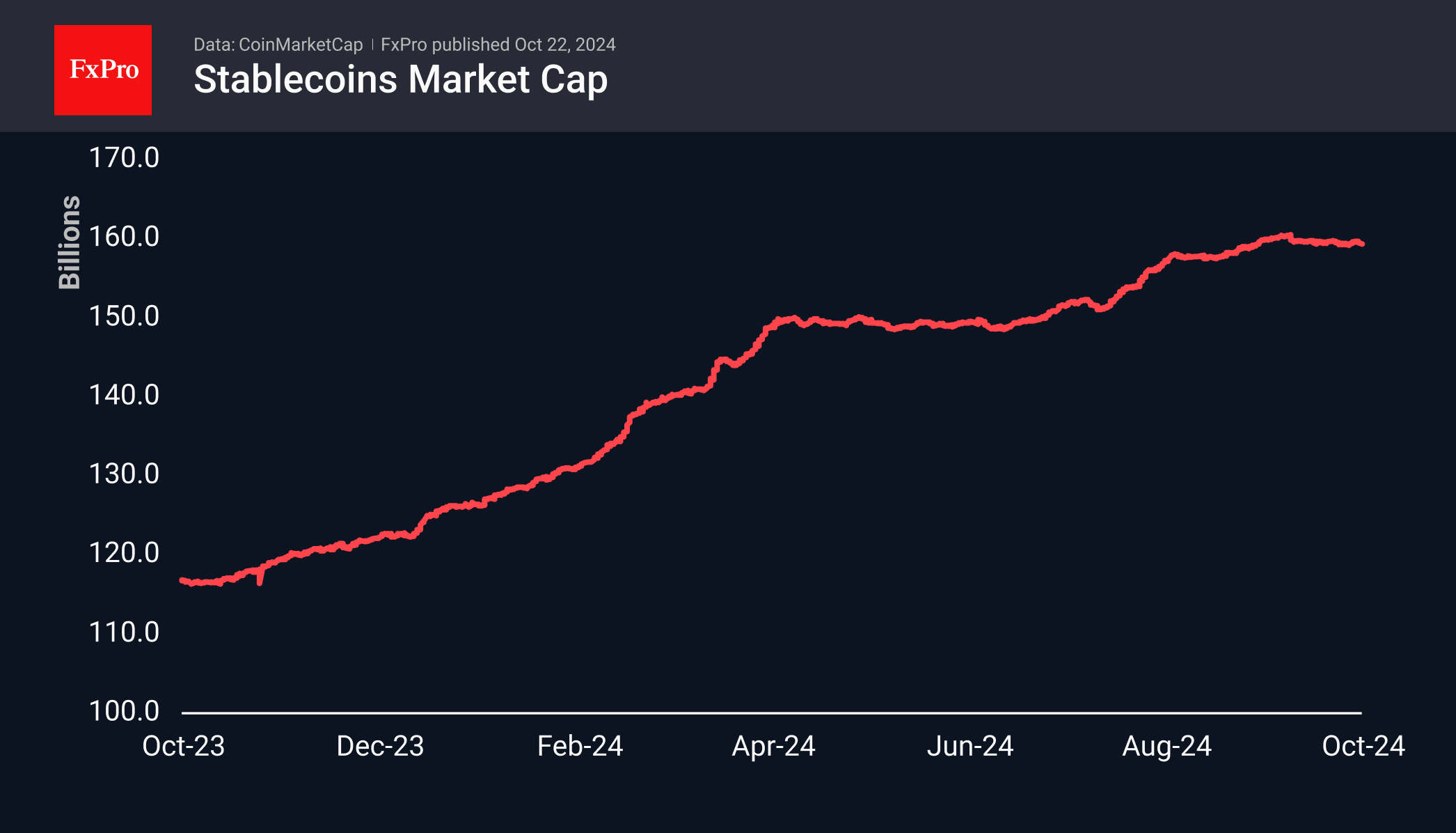С конца сентября перестал расти объём стейблкоинов, настраивая на потенциальную паузу в росте широкого рынка криптовалют, так как стейблкоины часто рассматриваются как ликвидность для быстрой покупки интересных монет. Прошлый импульс роста был с августа по сентябрь, когда общая капитализация крипторынка оттолкнулась от дна.