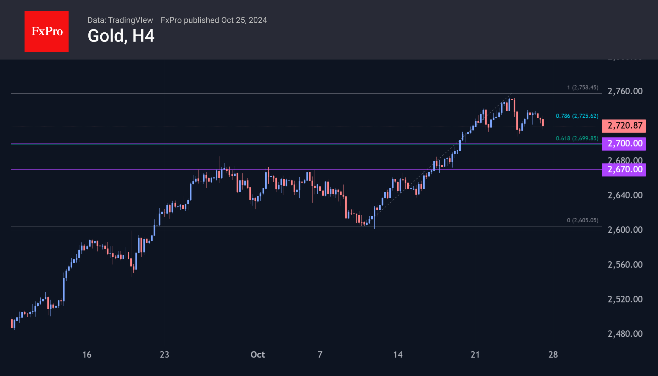 Цена золота продолжала переписывать исторические максимумы в первой половине недели, зафиксировав пик на уровне $2758 за тройскую унцию на спот рынке. Но уже в тот же день цена откатилась на $50, и после остаётся на удалении от пика из-за нарастающей осторожности в конце недели.