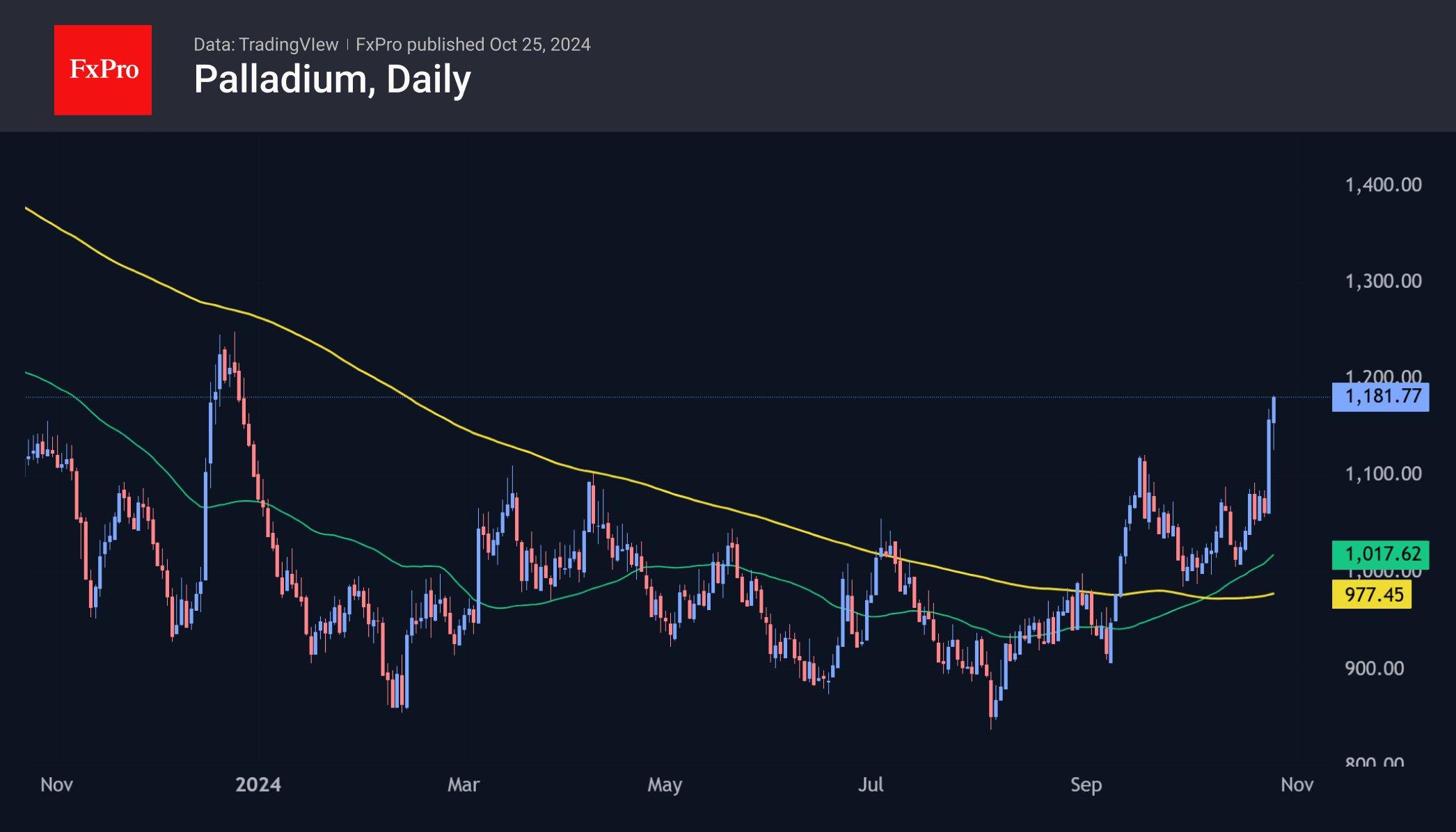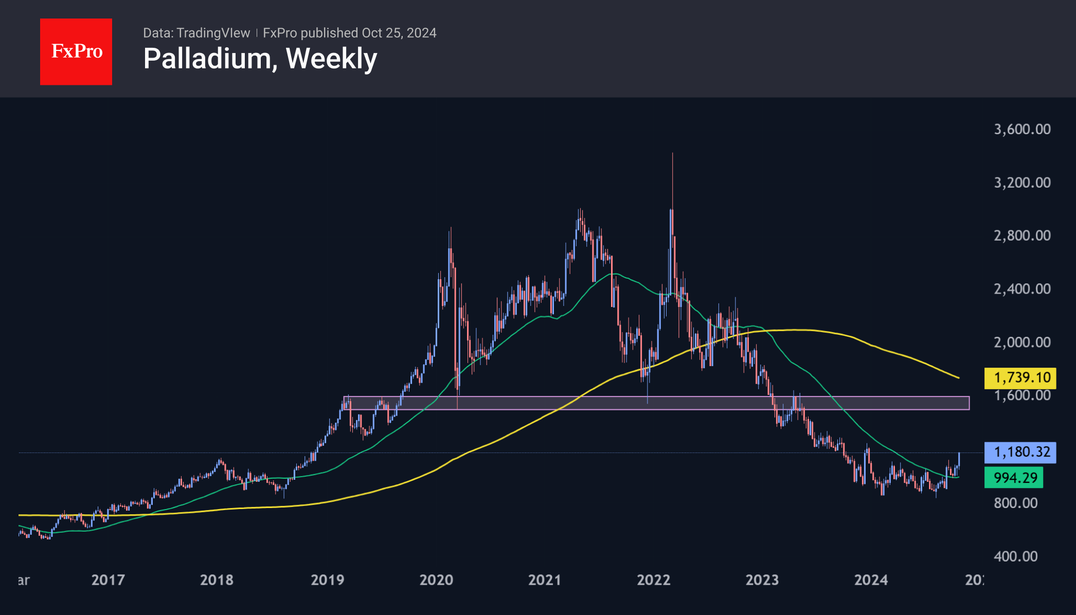 Палладий также рассматриваются в качестве драгоценных металлов, поэтому уже с начала октября демонстрировал повышательную динамику, и ещё в начале сентября сделал важный прорыв со стороны теханализа.