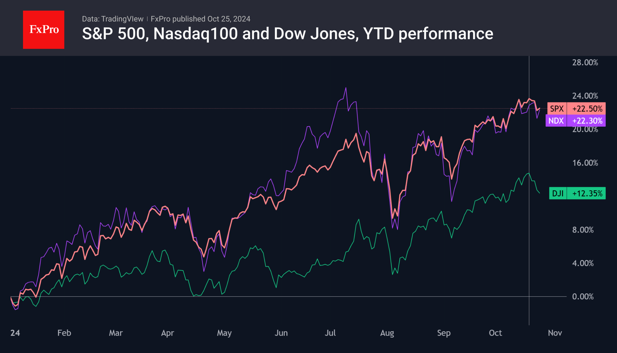Трио основных американских индексов S&P500, Nasdaq100 и Dow Jones теряли позиции после шести недель роста. Первые два нащупали основу для роста во второй половине недели на сильных отчётностях технологических компаний. Dow Jones при этом методично распродавался, откатившись в область плато в конце прошлого месяца.