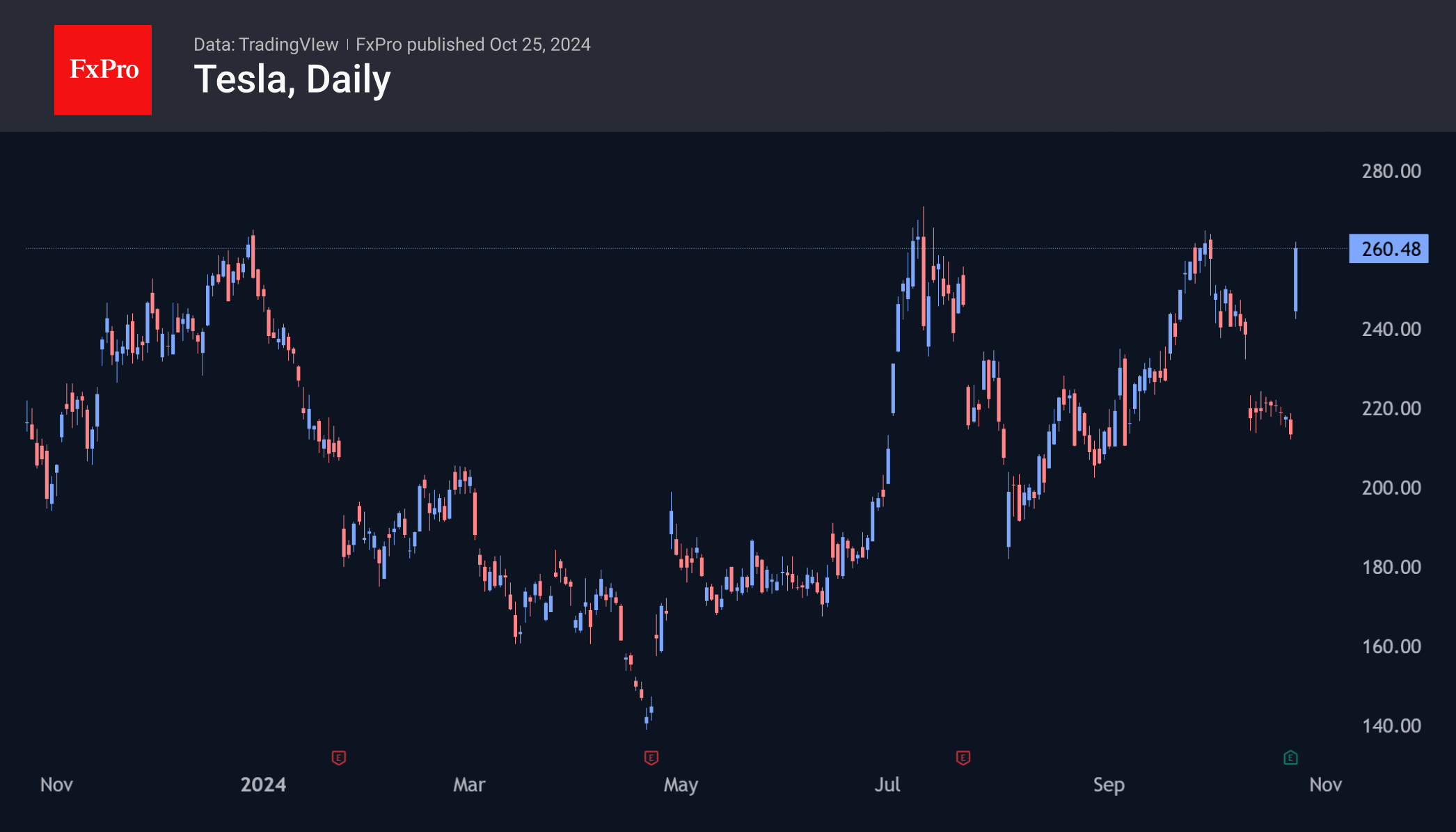 Прошедшая неделя была наиболее насыщенной в этом сезоне квартальных отчётностей. И не было недостатка в интересных историях. Важный позитив — более чем 20% скачок акций Tesla на оптимистичных прогнозах на следующий год и обещаниях представить дешевый электромобиль. Это был самый сильный дневной рост за последние 11 лет, который вывел цену акции в область максимумов последних 12 месяцев. Но даже сейчас цена на 35% ниже пика, зафиксированного почти ровно три года назад.