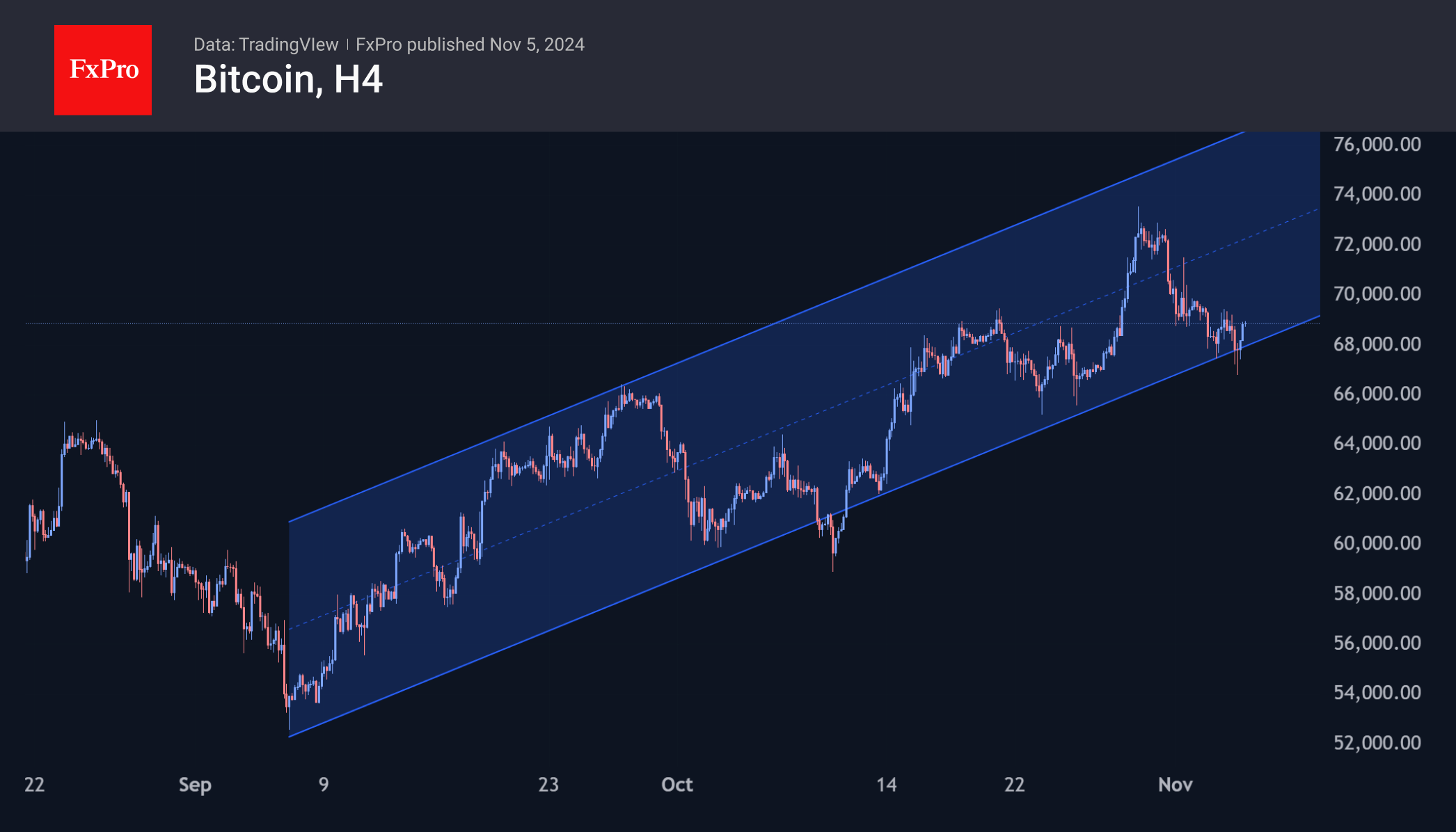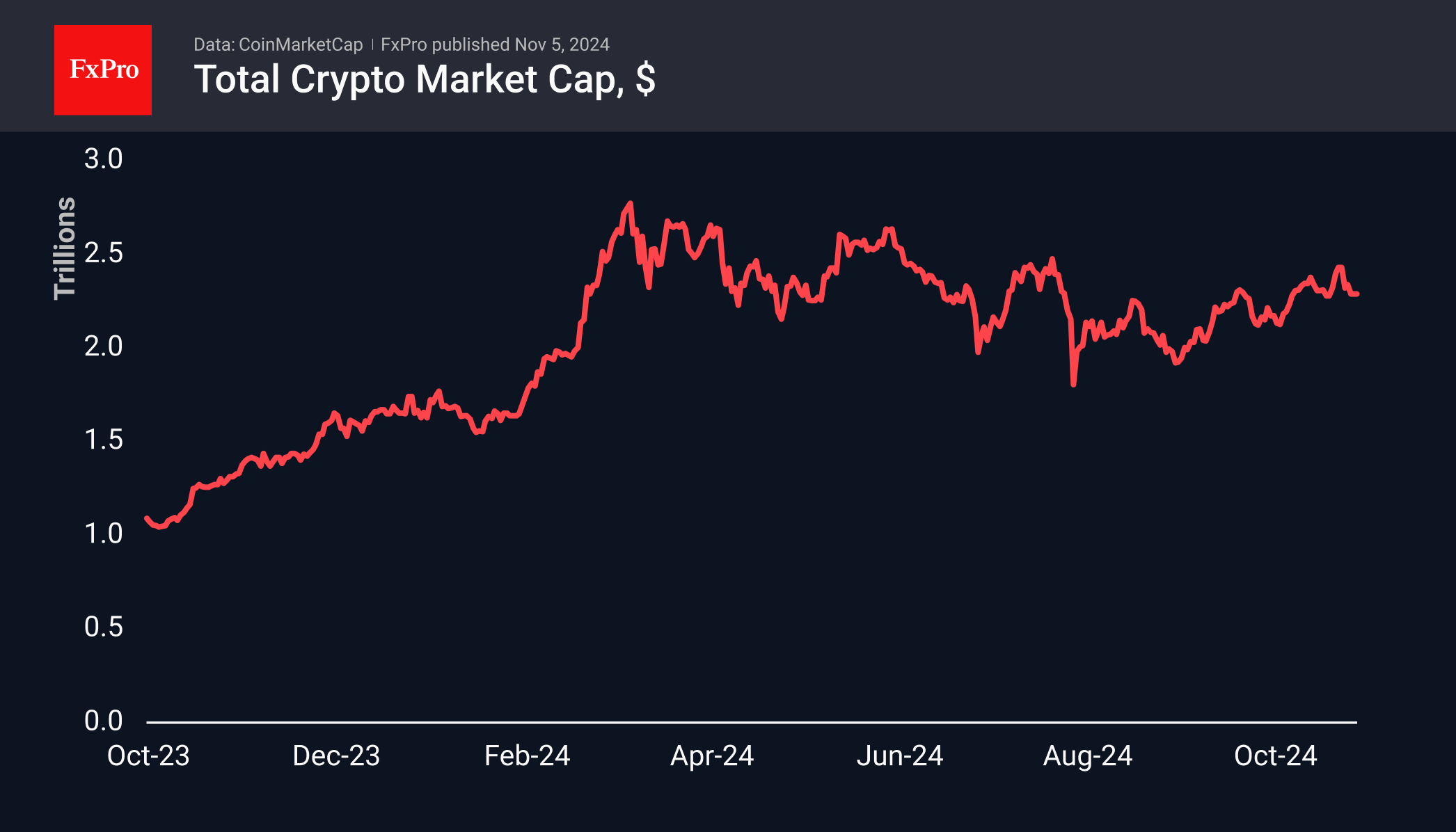 Капитализация крипторынка сохранилась на уровне $2.24 трлн. Это восстановление после того, как рынок достиг минимальной точки в самом конце торгов в понедельник на уровне $2.19 трлн. Этот откат в область минимумов за последние три недели мы продолжаем рассматривать как коррекцию после ралли в преддверии важнейших событий недели: выборов в США и решения по ключевой ставке ФРС. Интересно, что индекс криптовалютных настроений остаётся на территории жадности. Он не выходит за пределы диапазона 70–77 последние три недели, хотя за это время настроения на фондовом рынке скатились с порога экстремальной жадности к страху.