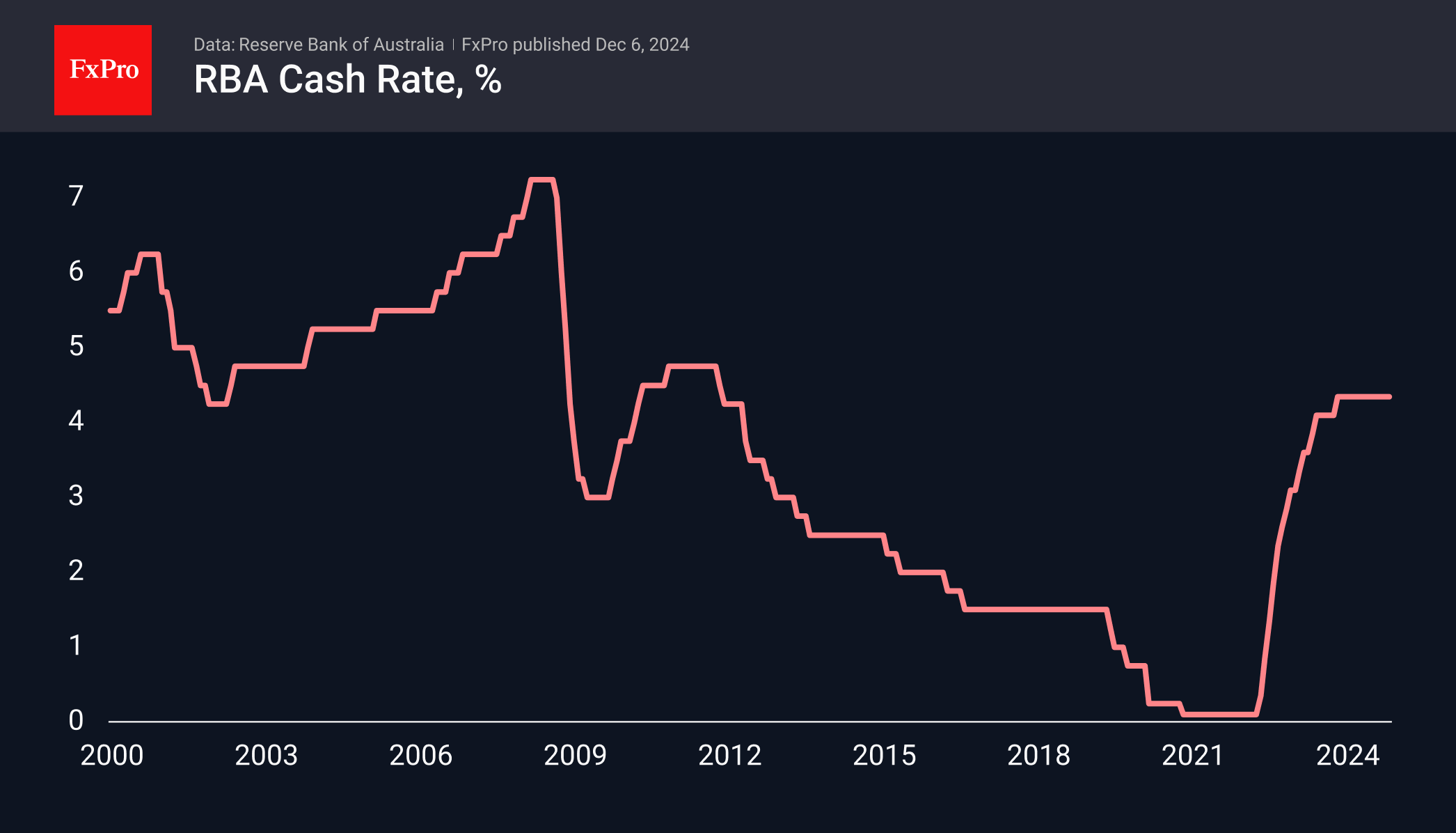 Вторник начнётся с решения по ставке Резервного Банка Австралии, которая находится на 12-летне максимуме 4.35% более года. Средний прогноз аналитиков не предполагает снижения и на этот раз. Но все коллеги по блоку G10 активно сокращают ставки. Увидим ли мы если не снижение, хотя бы намёк на него?