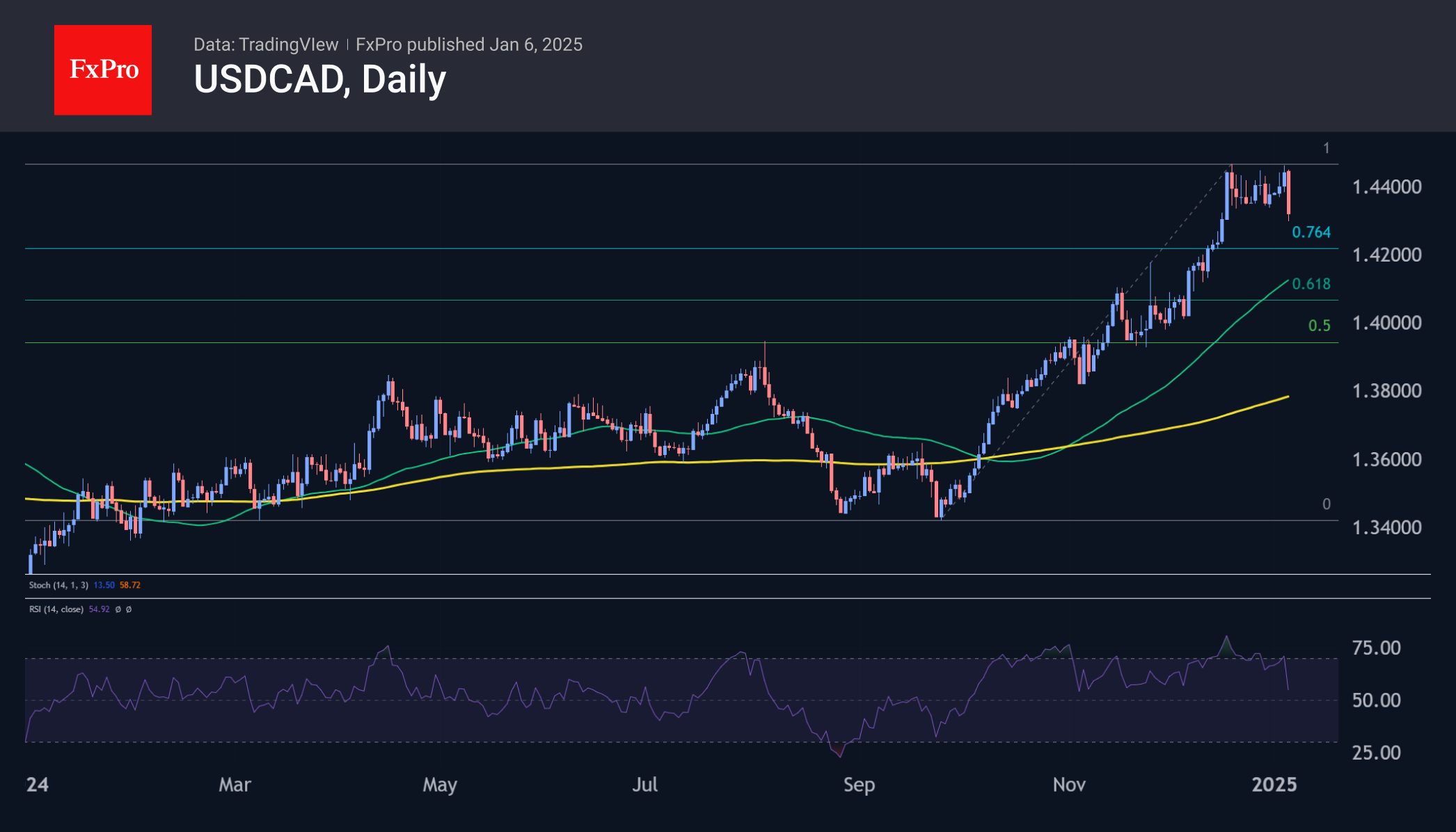 Текущее сильное снижение может быть началом разворота, на который рынки не решались в последние несколько недель. Далее стоит рассмотреть потенциальные цели снижения. В первую очередь такой целью выглядит область 1.42, где проходит уровень коррекции 76.4% от амплитуды роста с сентября по пик декабря. Классический откат до 61.8% уведёт котировку в область 1.4060. История также подсказывает, что снижение от экстремумов вблизи 1.45 может стать началом долгосрочной тенденции, уводящей USDCAD к 1.2000.