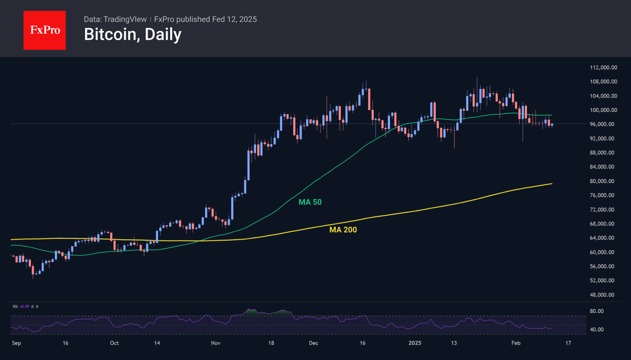 Биткоин во вторник в очередной раз отскочил от 50-дневной скользящей средней у $98 600, ставшей мощным сопротивлением последние семь дней. При этом внутри дня заметно усиление покупок на спадах ниже 95000. Динамика RSI рассказывает примерно ту же историю, что мы видим из индекса настроений: требуется более глубокое погружение в область перепроданности, чтобы привлечь покупателей.