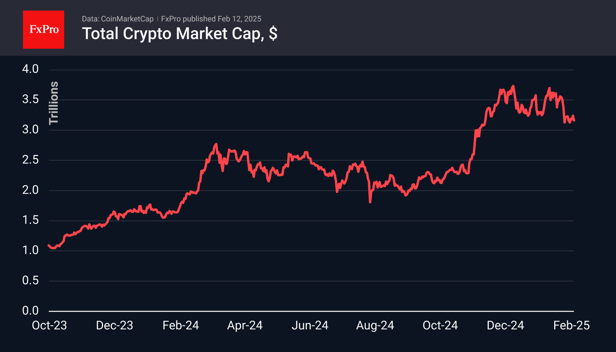 Крипторынок продолжает буксовать, откатившись на 2.7% до $3.15 трлн. после заигрывания с отметкой $3.3 днём ранее. На этой неделе рынок курсирует у нижней границы нисходящего коридора. Технически, от этих уровней выше шансы на отскок, но более разумной стратегией всё же выглядит ожидание, так как остаётся немалый шанс на ускорение спада после продолжительного периода слабости.