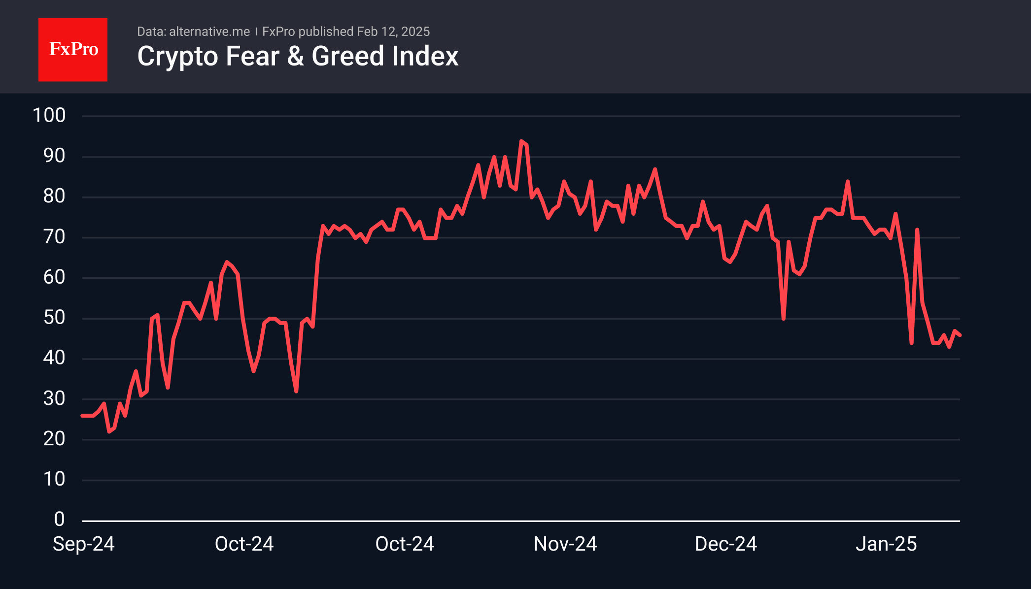 Криптовалютный индекс настроений курсирует между границами страха и нейтральной территории, потеряв 1 пункт до 46 к утру среды. По-прежнему, рынку не хватает страха, чтобы привлечь покупателей.