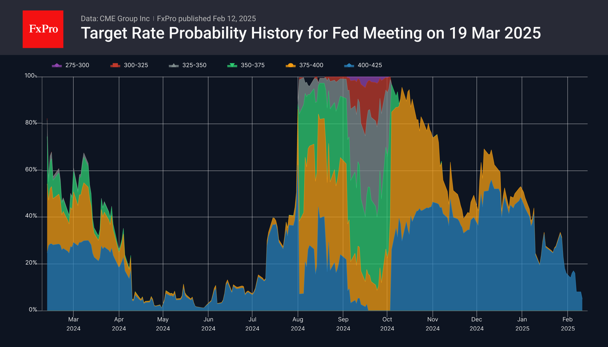 Такой подход не стал неожиданностью, но лишь развитием сигналов, которые подаёт ФРС последний месяц. Последние оценки FedWatch Tool дают 95% вероятность сохранения ключевой ставки 19 марта против 75% месяц назад и 83% неделю назад.