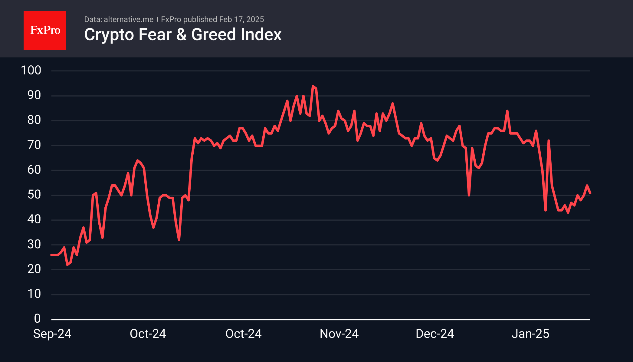 Биткоин движется практически строго горизонтально с 5-го февраля, большую часть времени курсируя вблизи $95000. Это ниже 50-дневной скользящей средней, ломая повышательную тенденцию. Однако отсутствие распродажи, указывает на сохранение интереса к долгосрочным покупкам на спадах вблизи текущих уровней.